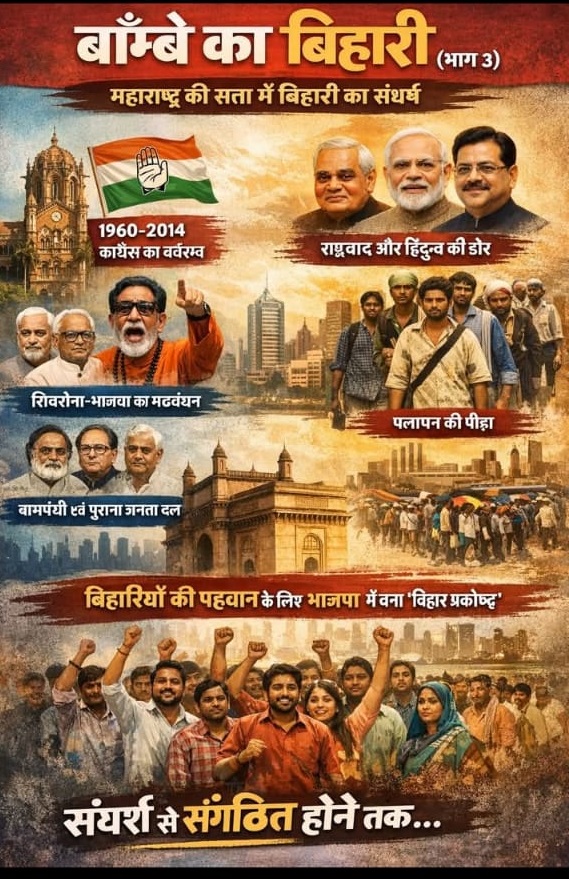 “बॉम्बे का बिहारी” (भाग ३):- मुंबई सहित महाराष्ट्र के विभिन्न शहरों में बसे बिहारियों की वर्तमान राजनीतिक स्थिति को समझने के लिए, हमें इस श्रृंखला को आगे बढ़ाते हुए राज्य की सत्ता संरचना, प्रमुख राजनीतिक दलों के इतिहास और बिहारियों के योगदान पर एक विस्तृत नजर डालनी होगी। यह समझना आवश्यक है कि कैसे बिहारियों ने धीरे-धीरे अपनी पहचान बनाने की कोशिश की, लेकिन लंबे समय तक वे राजनीतिक रूप से हाशिए पर ही रहे। इस भाग में हम महाराष्ट्र के राजनीतिक परिदृश्य का ऐतिहासिक अवलोकन करेंगे, विशेष रूप से कांग्रेस के प्रभुत्व से लेकर शिवसेना-बीजेपी गठबंधन के उदय तक, और इसमें बिहारियों की भूमिका पर प्रकाश डालेंगे।