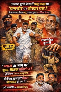 सच्चाई यह है कि पप्पू यादव इस समय न्याय के नाम पर अपनी राजनीतिक जमीन को बचाने की जद्दोजहद में लगे हुए हैं। वहीं, पटना पुलिस की यह अचानक और दिखावटी त्वरित कार्रवाई सरकार के दावों की पोल खोलती है। पुलिस इस पूरे प्रकरण में महज एक नट का जुमूरा भर साबित हुई—जिसे सरकार ने अपनी मर्जी से नचाया।