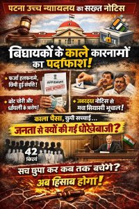 कल पटना उच्च न्यायालय द्वारा जारी किए गए नोटिस ने बिहार के राजनीतिज्ञों के उस काले चेहरे को पूरी तरह उजागर कर दिया है, जो वर्षों से राज्य की राजनीति को अंधकार में डुबोए हुए है। इस अंधकार की वजह से बिहार की आम जनता लगातार ठोकरें खा रही है, और राज्य विकास की दौड़ में लगातार पिछड़ता जा रहा है। यह घटना न केवल राजनीतिक भ्रष्टाचार की गहराई को दर्शाती है, बल्कि यह भी साबित करती है कि चुनावी प्रक्रिया में पारदर्शिता की कितनी कमी है, जो लोकतंत्र की जड़ों को कमजोर कर रही है।